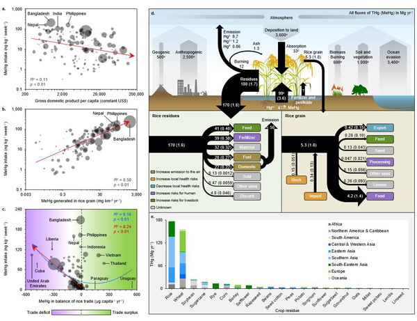 为填补这一知识鸿沟,该课题组以水稻的生命周期为基础,定量阐述了水稻中的汞如何在全球范围内与人类健康和环境系统的相互作用。研究发现,水稻可能也是全球人类甲基汞暴露的显著膳食来源,尤其是在南亚和东南亚。国际水稻贸易引发人类甲基汞暴露风险的区域转移,并显著加剧了非洲、中亚和欧洲的甲基汞暴露风险。世界上大多数地区居民因食用水稻而摄入的甲基汞不会超过鱼类,然而,在亚洲许多以稻米为主食的土壤污染地区,水稻和鱼类共同消费导致的甲基汞暴露可能成为一个重要的健康问题。