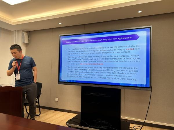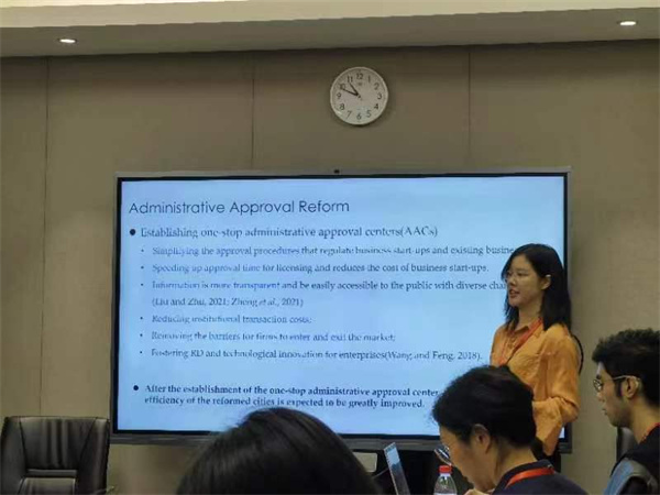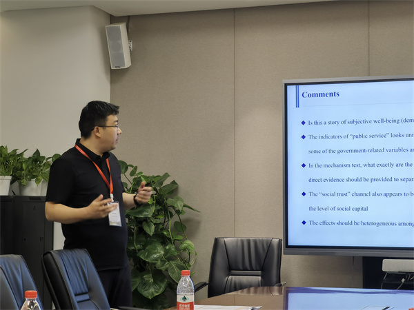 分会场14围绕“政策”这一主题展开,作为本次分论坛的主席,来自湖南大学的华博士首先介绍了汇报人以及评议人。接着,他做了关于有关西部大开发带来财政压力与公共产品供给不足的汇报。之后,来自琉璃神社 的博士候选人盛涵天同学汇报了有关疫情对区域产业动态及城市经济韧性影响的研究。在简短的休息后,来自苏州大学的张博士和来自上海财经大学的李博士分别就中国行政改革能否促进出口扩展以及城市边界扩展对居民满意度以及公共品供给的影响等问题进行研究汇报。