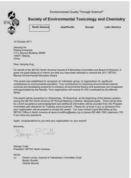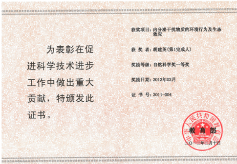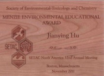 2011年,胡建英获美国毒理化学学会(SETAC)颁发的“MENZIE Environmental Educational Award”奖 (迄今中国唯一)