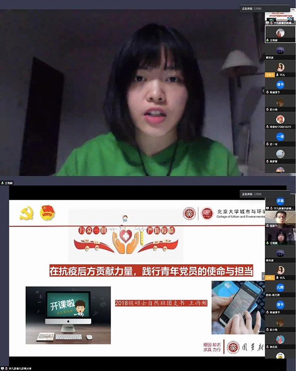 两位湖北同学各自介绍了家人在战疫一线工作的事迹。国庆70周年群众游行方阵队员、2018级本科城规班团支部余犀雨的母亲是襄阳市第一人民医院病理科主任医师,她和同事争分夺秒地对新冠肺炎患者的组织进行采样,取材、固定、包埋、切片、染色、显微镜观察。这次疫情让余犀雨看到了医护工作者的无私与伟大。同时他也回忆起参加国庆70周年群众游行训练中身边的青年党员、团员冲锋在前的担当,他表示,青年人要向这些优秀榜样学习,时刻准备好为人民挺身而出、勇往直前。2019级硕士党支部的李君怡用“感动、辛苦、焦虑、欣慰”四个关键词讲述了身在武汉的一家人参与社区一线防疫工作的感人事迹:为邻里间互助互爱、令人感动而感动;为道路难走、早出晚归而辛苦;为无证人员不听劝阻、担心自己感染病毒并进行传染而焦虑;为守职期间群众们的支持和感激而欣慰。通过这次疫情,她也更深切地体会到青年学子的本职和担当。李君怡发言后,与会所有师生集体鼓掌向武汉人民致敬,为武汉人民加油。