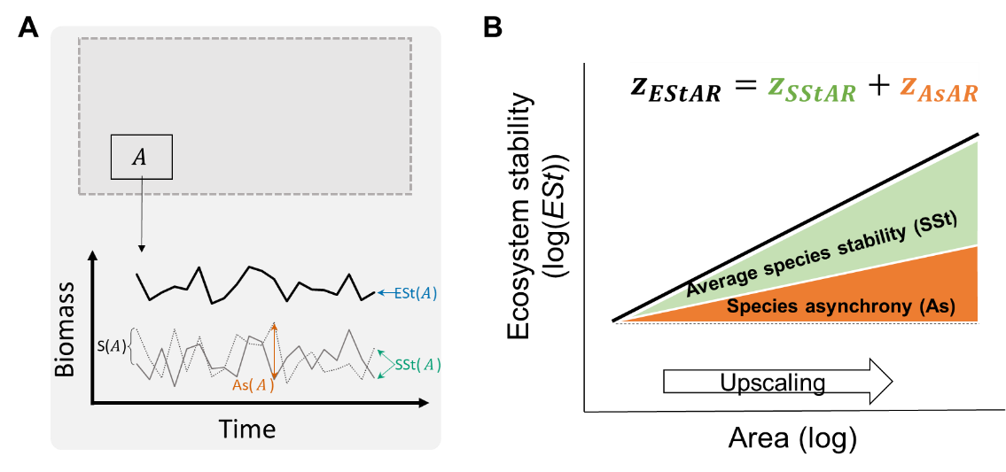 图1. (A) 生态系统稳定性(ESt)可以分解为物种稳定性(SSt)和种间异步性(As);(B)随空间尺度(面积)增加,生态系统稳定性随面积变化的速率(z_EStAR)等于物种稳定性随面积变化的速率(z_SStAR)与种间异步性随面积变化的速率(z_AsAR)之和