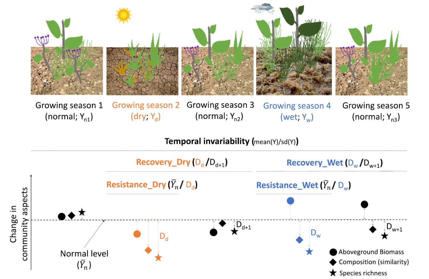 生态稳定性刻画了生态系统受到干扰时保持或恢复原有状态的能力。在全球变化背景下,生态系统功能和服务的长期维持有赖于其稳定性。对草地生态系统而言,富营养化和极端气候可显著改变群落多样性和生产力,从而威胁生态系统稳定性。然而理解生态系统稳定性维持机制的一大挑战在于:稳定性是一个多维度概念,在不同干扰方式、不同生态系统功能指标、不同响应阶段下都有相应的稳定性定义方法(图1)。比如,在极端干旱或极端降水干扰下,草地生态系统的稳定性可定义为其在干扰发生中生物量的变化(抵抗力稳定性)或干扰后生物量的恢复速率(恢复力稳定性)。另外,抵抗力和恢复力不仅可通过生物量的变化来度量,也可基于生态系统多样性或物种组成的变化进行计算。不同稳定性指标可能存在一定程度的相关性:如果不同指标间的相关性很强,那么改变某一指标可能会类似地改变其他指标,因此稳定性本质上具有较低的维度;如果不同指标的相关性较弱,则表明其背后的影响机制可能不同,从而稳定性具有较高的维度。然而以往研究主要关注某一稳定性指标,关于全球变化如何影响稳定性的不同指标及其相关性仍缺乏认识。