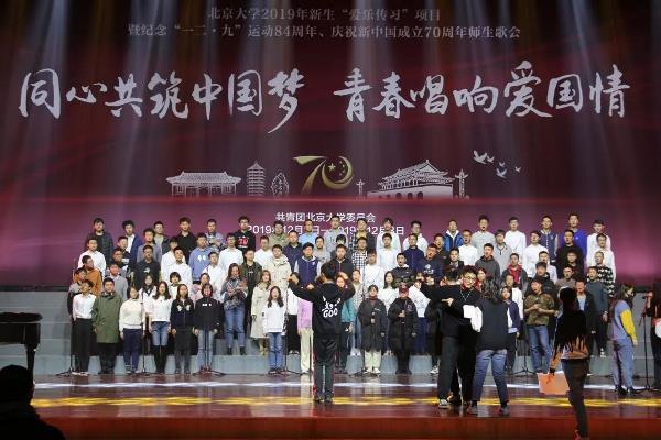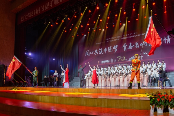 我们的歌声在逸夫贰楼、英杰交流中心、新太阳学生中心、对外汉语教育学院先后响起,而今天终于在百年纪念讲堂唱出对祖国的热爱。学院党委团委老师、班主任、辅导员和新生们一起参与训练、共同登台表演。