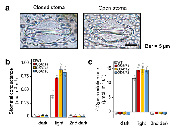 a, 水稻气孔保卫细胞开闭时的形态;b, 在光/暗条件下,改良型与野生型水稻的气孔导度差异;c, 在光/暗条件下,改良型与野生型水稻的光合作用速率差异。(图中,WT为野生型水稻;OSA1#1~#3为改良型水稻。)