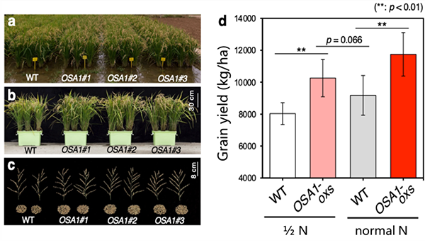a~c, 大田实验中改良型与野生型水稻的生长、稻穗形态以及种子产量的比较图(其中,WT为野生型水稻;OSA1#1~#3为改良型水稻);d, 在正常施肥或施肥量减半的条件下,改良型与野生型水稻的产量比较(其中,WT为野生型水稻;OSA1-oxs为3种改良型水稻的平均结果。)