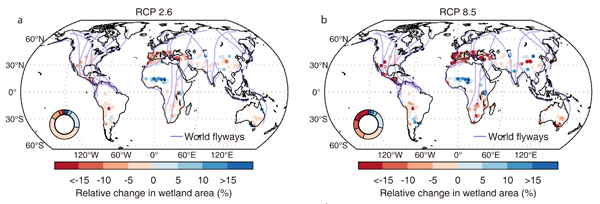 图2. RCP2.6与RCP8.5情景下冬季 (12月,1月和2月) Ramsar内陆湿地的面积变化。紫色线条代表全球主要的水鸟迁徙路线。
