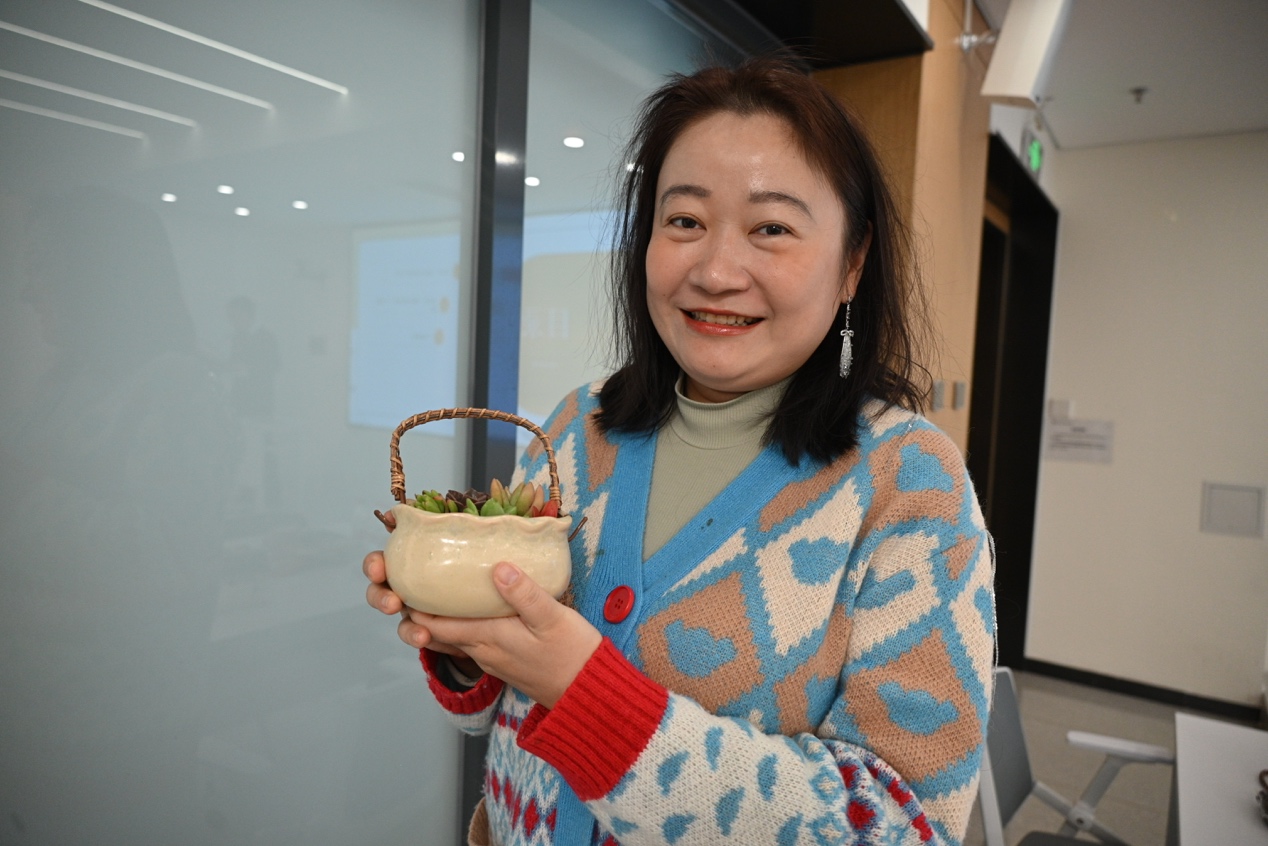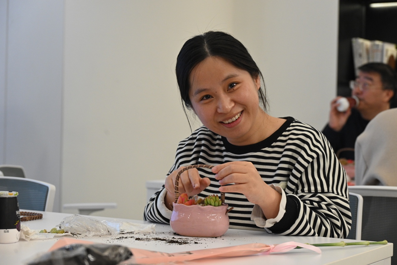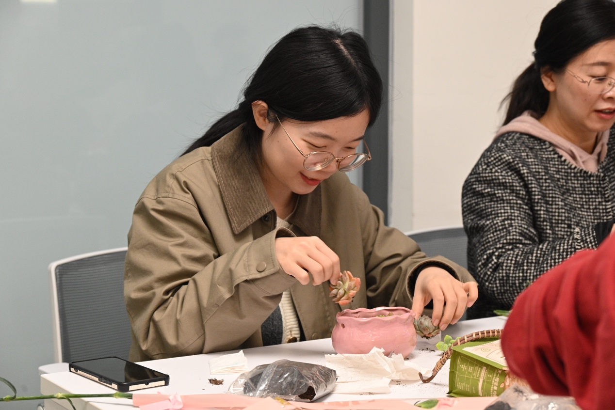 随后,各位老师精心挑选多肉植株,细致完成填土、配色、栽种等工序。在指尖与自然的对话中,一盆盆造型别致、意趣盎然的微景观渐次呈现,既展现了女同胞们对生活美学的独到见解,也传递出对美好生活的向往热爱,大家互相交流创作心得,现场洋溢着欢声笑语。