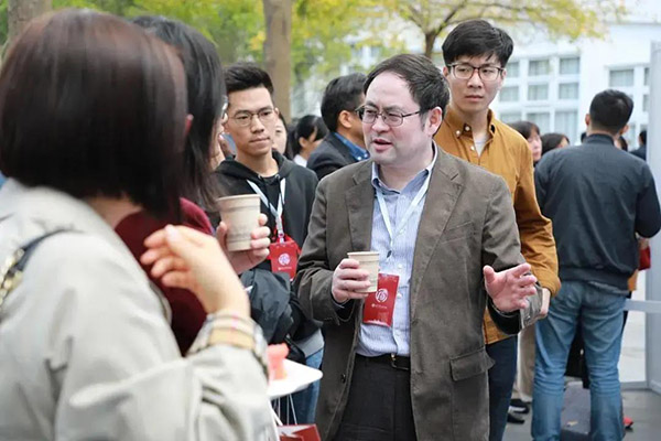 柴彦威在会议茶歇与同行交流(2019)
