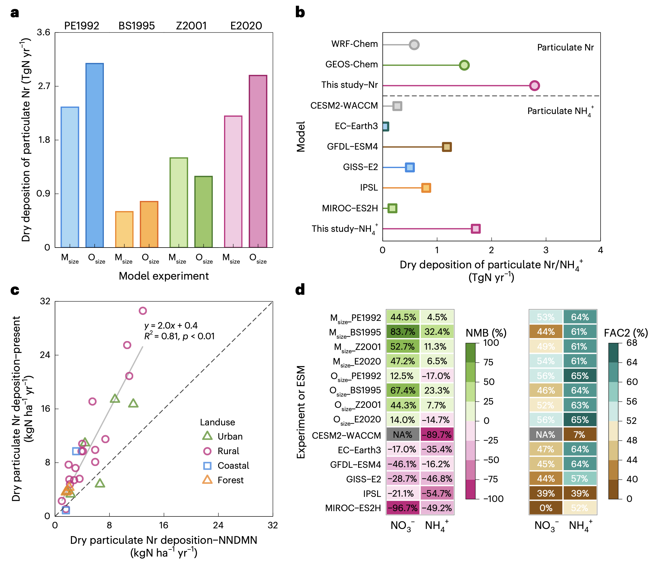 研究团队基于中国实测的气溶胶粒径数据,并结合四种主流干沉降机制,重新构建了中国区域高精度的大气氮沉降数据集。结果表明,WRF-Chem和GEOS-Chem等常用大气化学模型低估了中国地区的颗粒态氮干沉降通量。在不同模型实验中,颗粒氮的年干沉降通量估值范围为0.6至3.1 TgN,其中观测约束机制(Osize_E2020)估算值为2.9 TgN,远高于WRF-Chem默认机制(0.6 TgN)和GEOS-Chem默认机制(1.5 TgN)。此外,研究还发现,参与CMIP6的地球系统模型普遍低估了NH4+(颗粒态氮的主要组分)的干沉降通量;中国氮沉降监测网(NNDMN)也对颗粒态氮干沉降存在约一倍的低估(图2)。