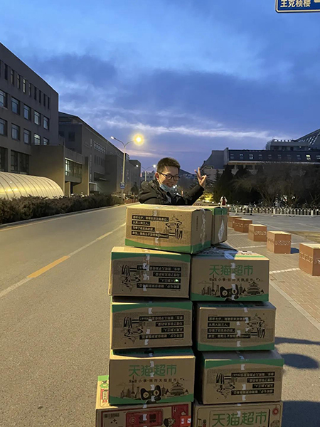 团委书记谭卓立老师、常务副书记宋宛儒老师与志愿者将物资送至万柳学生宿舍