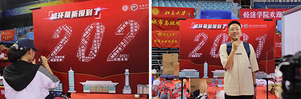 每一位报到的新生都在展板上留下了自己的名字,并满怀热情地接受了迎新现场的采访。“先做个自我介绍吧!……说说你对接下来四年的期待!……” “小鲜肉”们在采访前以一句“城载世界 环抱未来”展开自己的回答,这无疑体现了对加入城环大家庭的兴奋与期盼。采访中,他们展露了加入北大城环的激动,对迎新现场的惊喜,对未来四年生活的期待,对未名湖畔博雅塔下光影的憧憬。