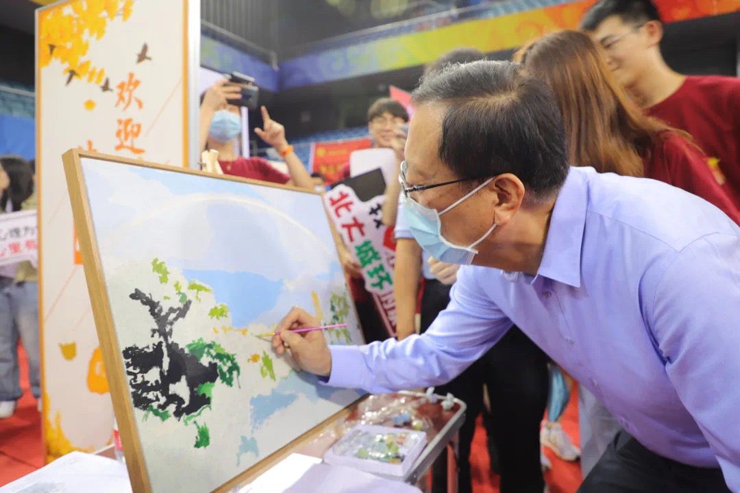 学院院长贺灿飞、党委书记刘耕年在迎新现场同新生亲切交流,细致查看迎新每个步骤、细节,详细了解迎新情况,并参与了本科新生第一幅画作,向新生送去了温暖的祝福。