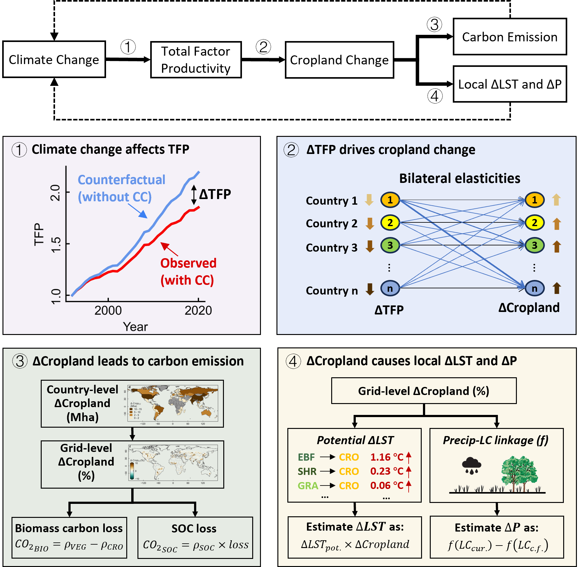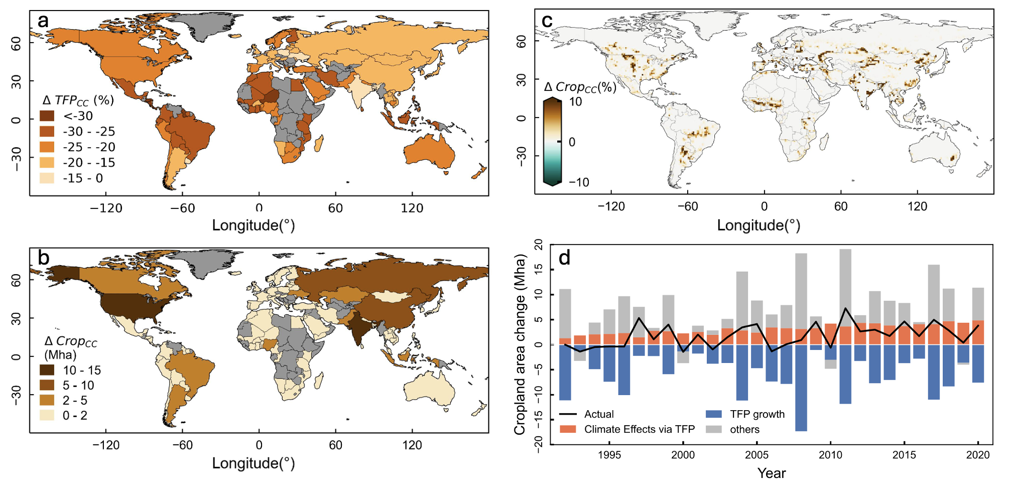 过去30年,全球耕地面积扩张了约5%至10%,这一过程直接或间接释放了大量温室气体,占全球农食系统排放的三分之一左右。提升农业生产效率被广泛认为是保障粮食安全、抑制耕地扩张、减缓环境压力的关键途径。然而,气候变化正在逐步削弱农业生产效率,从而迫使更多土地被开垦用于维持现有的粮食产量,加剧了粮食生产与生态保护之间的矛盾。这一趋势已成为全球关注的焦点问题。然而,目前学界对气候变化驱动耕地扩张的影响路径及其反馈效应仍缺乏系统研究和量化分析,尚无科学应对的基础。